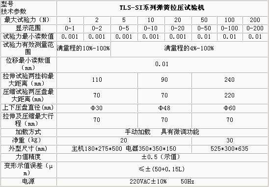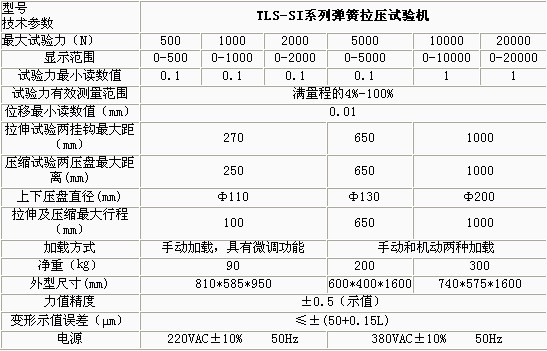 產(chǎn)品概述: TLS-SI系列雙數(shù)顯示拉壓彈簧試驗(yàn)機(jī)采用集成電路、微機(jī)技術(shù)對位移、試驗(yàn)力兩參數(shù)進(jìn)行電子檢測、數(shù)字顯示并對試驗(yàn)結(jié)果進(jìn)行打印。施加試驗(yàn)力為手動,還可以對負(fù)荷傳感器位移作自動修正。,適用于各種精密拉伸和壓縮螺旋彈簧試驗(yàn)機(jī)及對脆性材料的強(qiáng)度測 功能特點(diǎn): 數(shù)字顯示位移、負(fù)荷,彈簧檢測儀,精確直觀并對試驗(yàn)結(jié)果進(jìn)行打印 采用ISP技術(shù)編程,彈簧剛度試驗(yàn)機(jī),對負(fù)荷傳感器的變形自動修正 試驗(yàn)力、位移任意點(diǎn)清零,彎曲扭轉(zhuǎn)試驗(yàn)機(jī),可任意設(shè)定檢測基準(zhǔn) 具有峰值保持、過載保護(hù)等功能 技術(shù)參數(shù):
