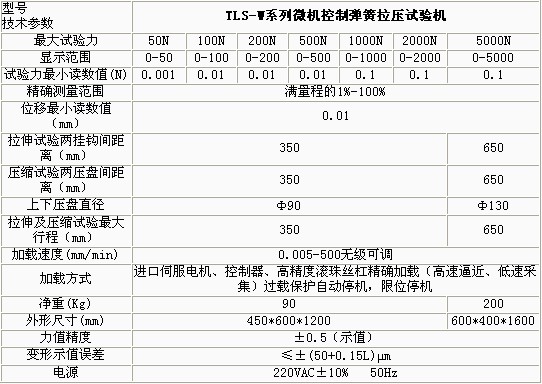 產(chǎn)品概述: TLS-WI系列微機(jī)控制拉壓彈簧試驗(yàn)機(jī)依據(jù)JB/T7796-2005《拉壓彈簧試驗(yàn)機(jī)技術(shù)條件》規(guī)定的技術(shù)要求制成。該型拉壓彈簧試驗(yàn)機(jī)主要用 于測(cè)試各種螺旋彈簧及彈性元件的強(qiáng)度,即在一定的變形量(或高度)下測(cè)試彈簧的試驗(yàn)力或在一定的試驗(yàn)力下測(cè)定彈簧的高度或變形量。 功能特點(diǎn): 本機(jī)主要適用于各種彈簧的強(qiáng)度試驗(yàn)、力學(xué)性能及工序能力分析。 本機(jī)軟件包有速度控制、參數(shù)輸入、數(shù)據(jù)處理、結(jié)果觀察、圖表顯示、圖表打印、數(shù)據(jù)保存等功能模塊組成。 試驗(yàn)方式多樣化,日本彈簧試驗(yàn)機(jī),可以設(shè)置彈簧的試驗(yàn)力,檢測(cè)彈簧的剩余高度或變形量;也可以設(shè)置彈簧的剩余高度或變形量,彈簧壽命試驗(yàn)機(jī),檢測(cè)試驗(yàn)力等功能。 多點(diǎn)自動(dòng)變速采集數(shù)據(jù),彈簧試驗(yàn)標(biāo)準(zhǔn),并自動(dòng)返回到初始位置,整個(gè)試驗(yàn)過(guò)程自動(dòng)化。 過(guò)載自動(dòng)返回,以保護(hù)傳感器不受損壞。 具有強(qiáng)大的數(shù)據(jù)處理及數(shù)據(jù)統(tǒng)計(jì)功能,繪制剛度曲線、計(jì)算彈簧的分段剛度,可以進(jìn)行數(shù)據(jù)統(tǒng)計(jì),繪制正態(tài)分布圖、計(jì)算工序能力指數(shù)。采用數(shù)控電機(jī)調(diào)速系 統(tǒng)或進(jìn)口交流伺服電機(jī)及調(diào)速器和精密滾珠絲杠副組成傳動(dòng)系統(tǒng),與高精度負(fù)荷傳感器、位移傳感器及數(shù)字式數(shù)據(jù)采集卡、PC組成測(cè)控系統(tǒng),實(shí)現(xiàn)了穩(wěn)定可靠運(yùn)行 及精確測(cè)量。 技術(shù)參數(shù): ![]() ![]()
