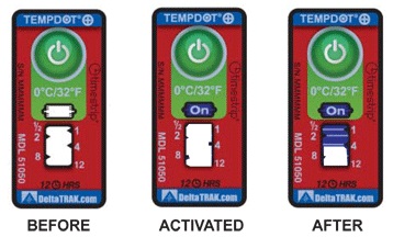 TempDot™Plus標(biāo)簽應(yīng)存儲(chǔ)在室溫下,,并必須在反應(yīng)溫度閾值以上被激活。激活是通過(guò)用手指推壓。"On"字出現(xiàn)在第一個(gè)窗口中顯示激活。之后5分 鐘內(nèi),在反應(yīng)溫度或低于反應(yīng)溫度的情況下將標(biāo)簽貼到產(chǎn)品上。藍(lán)色染料熔化并以控制的速率遷移,經(jīng)過(guò)白色大窗口。這表示暴露在溫度閾值以上的累計(jì)時(shí)間。當(dāng)溫 度低于閾值時(shí),,該染料固化并停止移動(dòng)。如果溫度超過(guò)閾值,TempDot®Plus標(biāo)簽提供即時(shí)的視覺(jué)跡象。