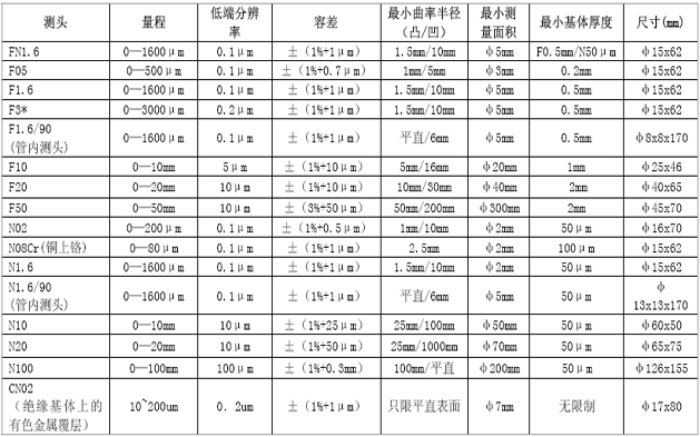 Mintest 1100-4100系列涂層測(cè)厚儀可選用測(cè)頭的技術(shù)數(shù)據(jù)